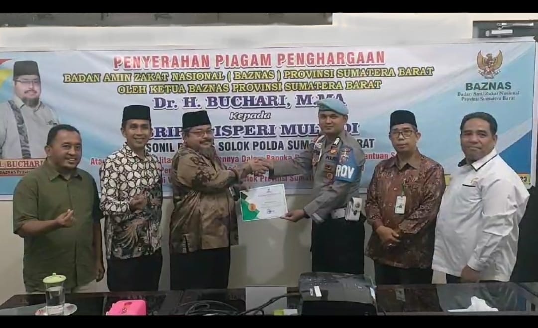 Solok, Anggota Polres Solok Polda Sumbar, Bripka Isperi Mulyadi kembali jadi sorotan. Ya, pria asal nagari Sulit Air Kecamatan X Koto Diatas Kab. Solok ini dianugerahi Piagam Penghargaan dari Badan Amil Zakat Nasional ( BAZNAS ) Propinsi Sumatera Barat.