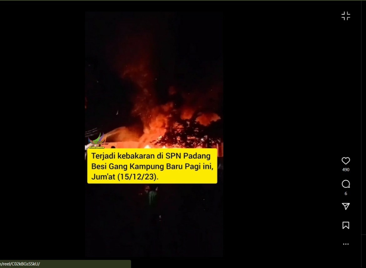 Akun Instagram dengan nama @babesumbar, dalam caption nya bertuliskan “Telah Terjadi kebakaran di SPN Padang besi gang kampung baru pagi ini, jumat (15/12/23).