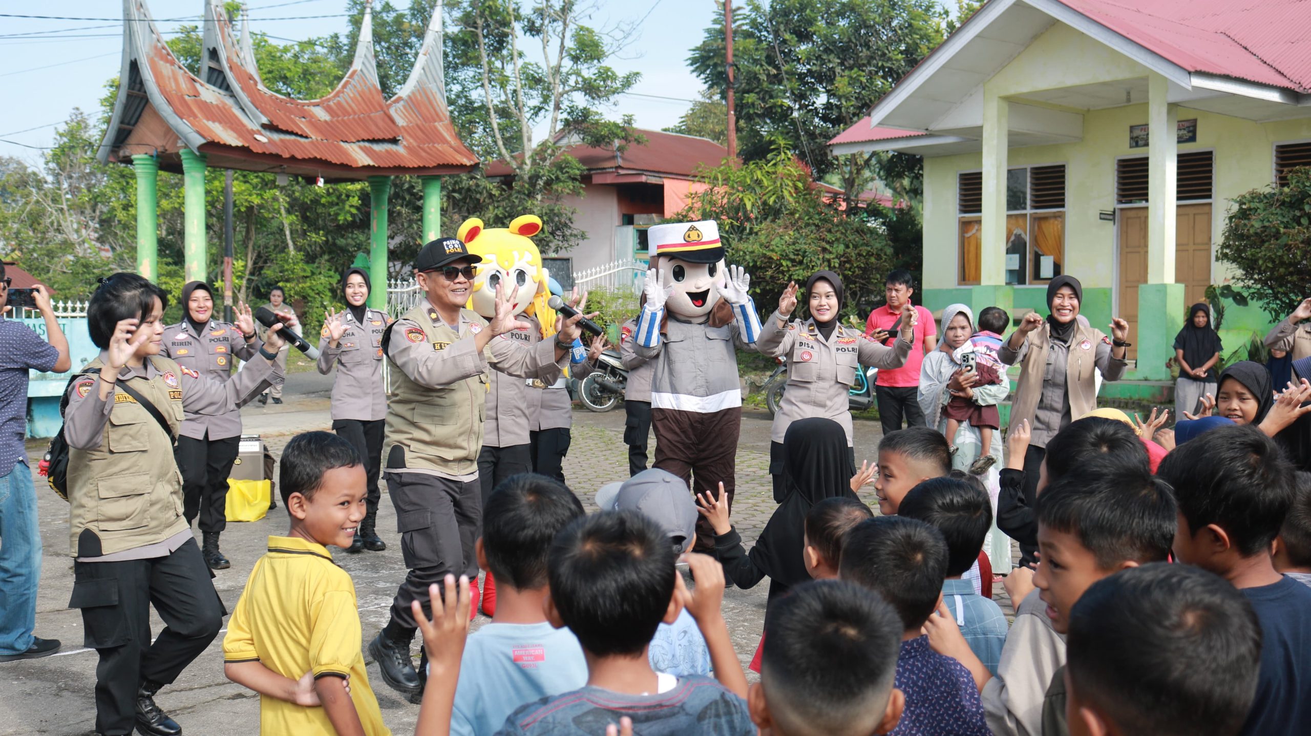 Tanah Datar, Puluhan anak-anak sekolah dasar terlihat berkumpul di SDN 07 Sungai Jambu Kecamatan Pariangan. Raut wajah senang gembira terpancar dari anak-anak tersebut setelah puluhan personel Polri bermain bersamanya, Minggu (19/5) pagi.