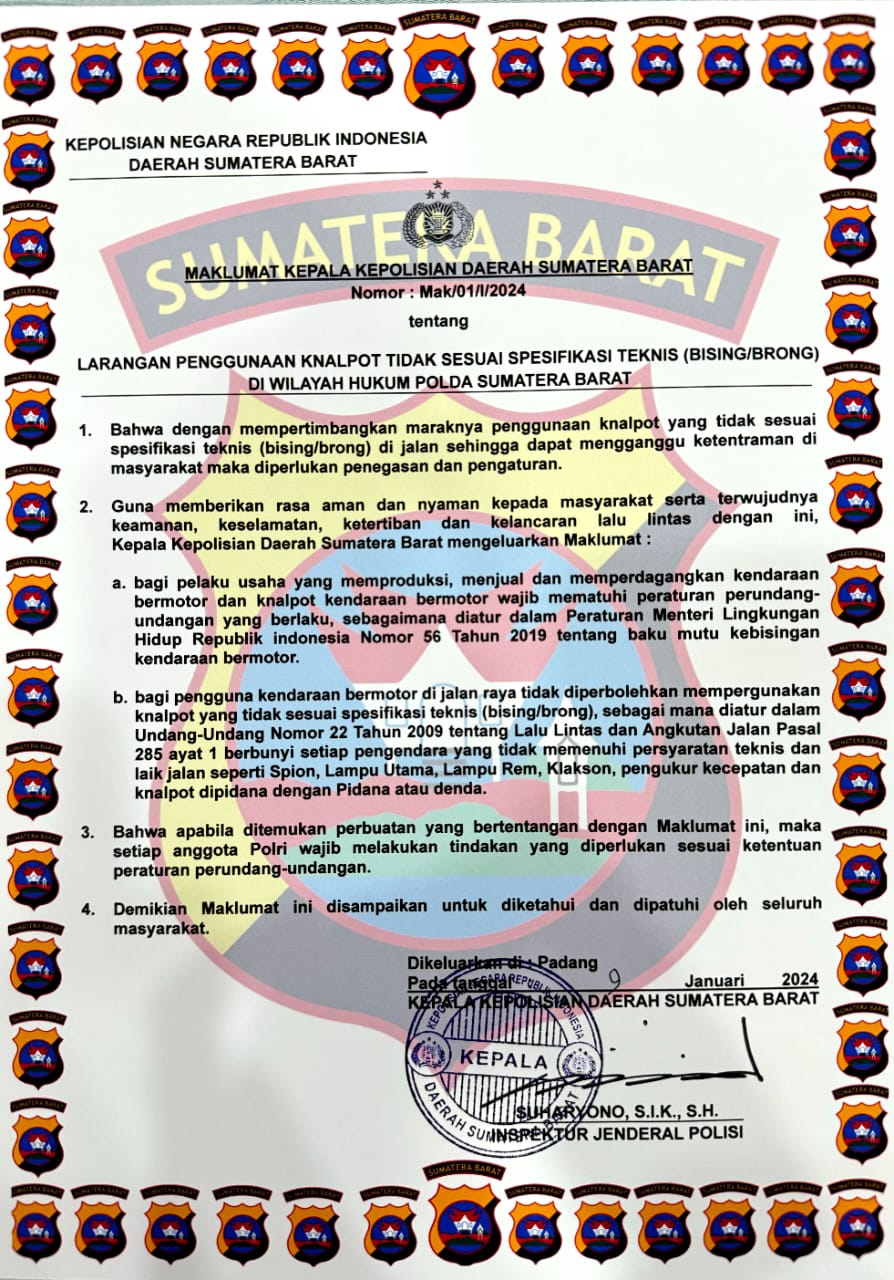 Sumbar, Polda Sumatera Barat (Sumbar) mengeluarkan larangan penggunaan knalpot tidak sesuai spesifikasi teknis (bising/brong) di wilayah hukum Polda Sumbar.