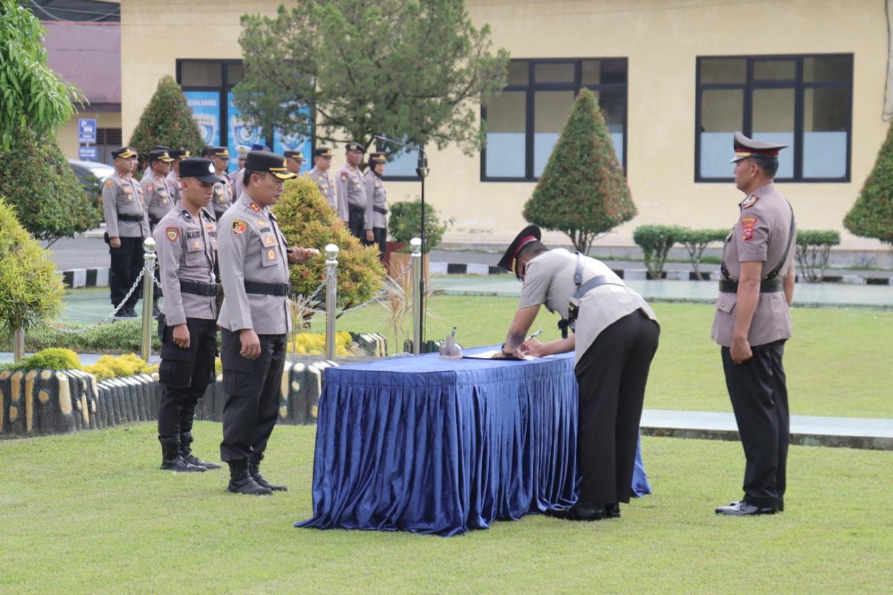 Pasaman Barat, Kapolres Pasaman Barat AKBP Agung Tribawanto, S.Ik memimpin kegiatan upacara serah terima Jabatan Kapolsek Lembah Melintang dan pelantikan Kasi Humas, serta KA SPKT yang dilaksanakan dilapangan apel Polres Pasaman Barat, Jumat sore (15/3/2024).