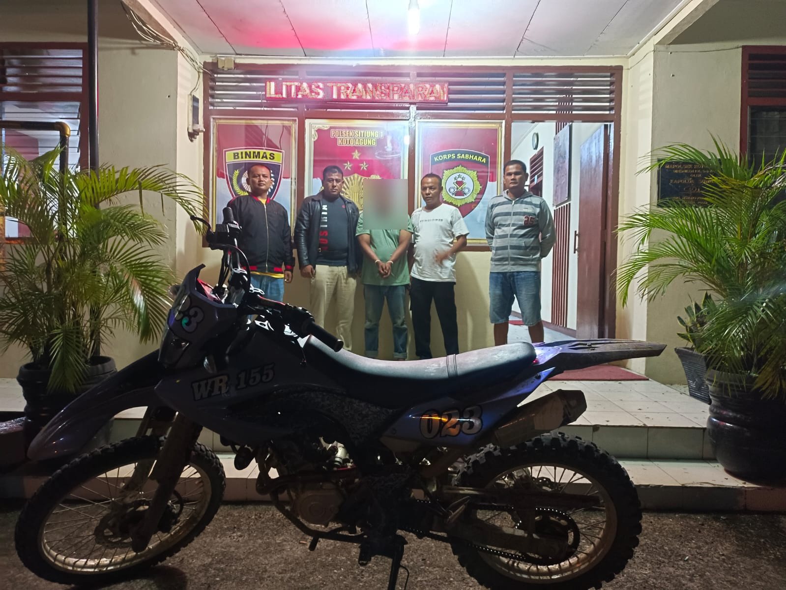 Setelah menerima informasi mengenai keberadaan pelaku di sebuah rumah makan di depan Pabrik Karet Thailand, Kecamatan Jujuhan, Kabupaten Muaro Bungo, Unit Reskrim Polsek Sitiung yang dipimpin oleh Kapolsek berhasil menangkap pelaku beserta sepeda motor Yamaha WR pada Sabtu, 28 Oktober 2023, sekitar pukul 09.00 WIB.
