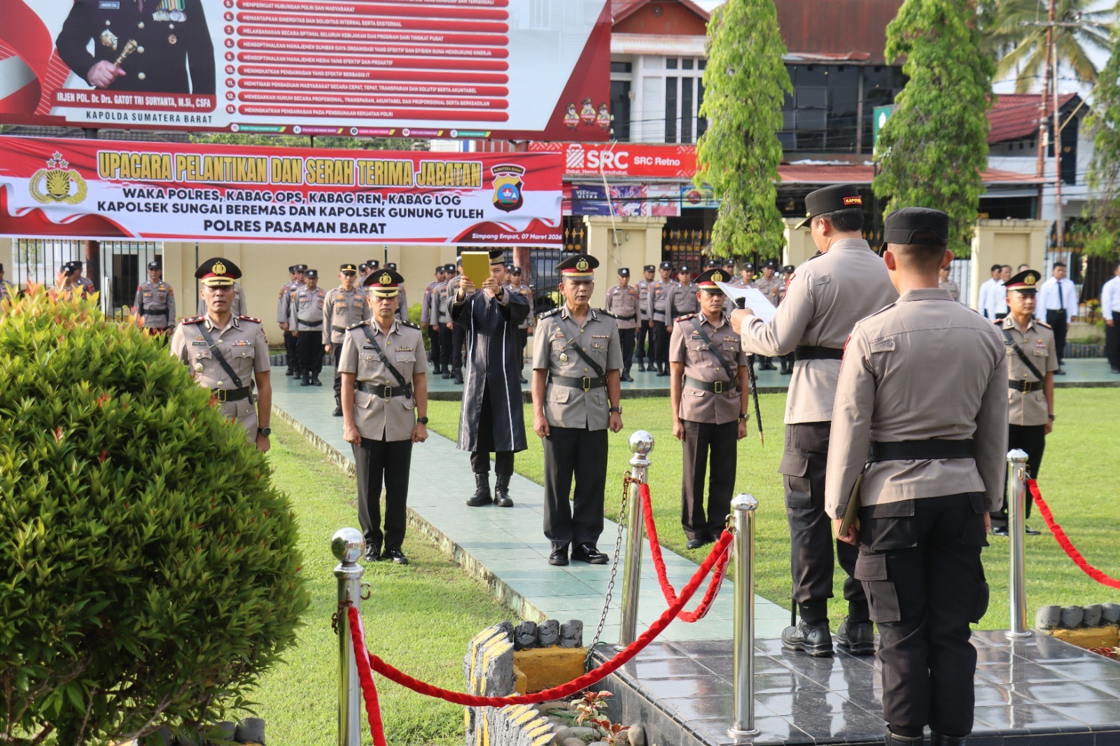 Pasaman Barat, Kepolisian Resor Pasaman Barat, Polda Sumatera Barat (Sumbar) menggelar upacara Pelantikan dan Serah Terima Jabatan (Sertijab) sejumlah Pejabat Utama (PJU) dan Kapolsek jajaran Polres Pasaman Barat, yang dilaksanakan di halaman Mako Polres setempat, Sabtu (7/3/2026) sore.