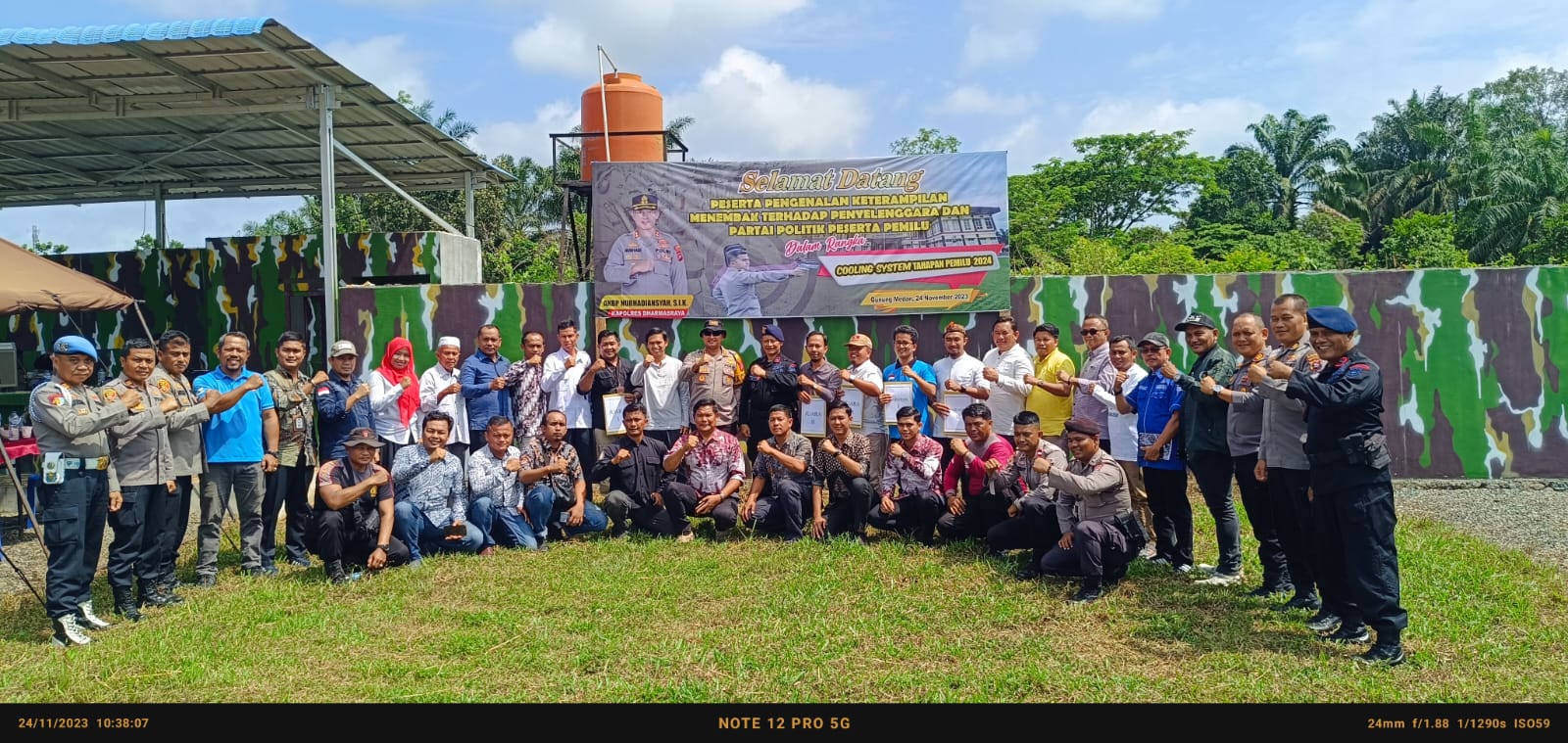 Dharmasraya, Guna memantapkan sistem keamanan dan menjaga netralitas menjelang Pemilu 2024, Polres Dharmasraya Polda Sumbar, bekerja sama dengan penyelenggara dan partai politik peserta pemilu, menggelar latihan pengenalan keterampilan menembak di lapangan tembak Sarja Arya Racana Polres Dharmasraya pada Jumat tanggal 24 November 2023, pukul 07.00 WIB.