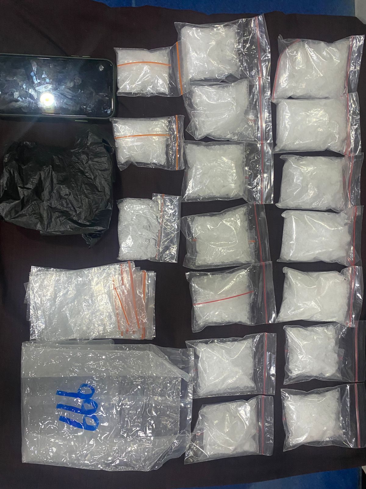 Sebanyak 17 plastik klip bening tersebut diduga sebagai pembungkus sabu dan satu unit Hanphone IOS merk iPhone 11 warna hitam yang ditemukan diatas lantai dalam kamar kost pelaku Dava.