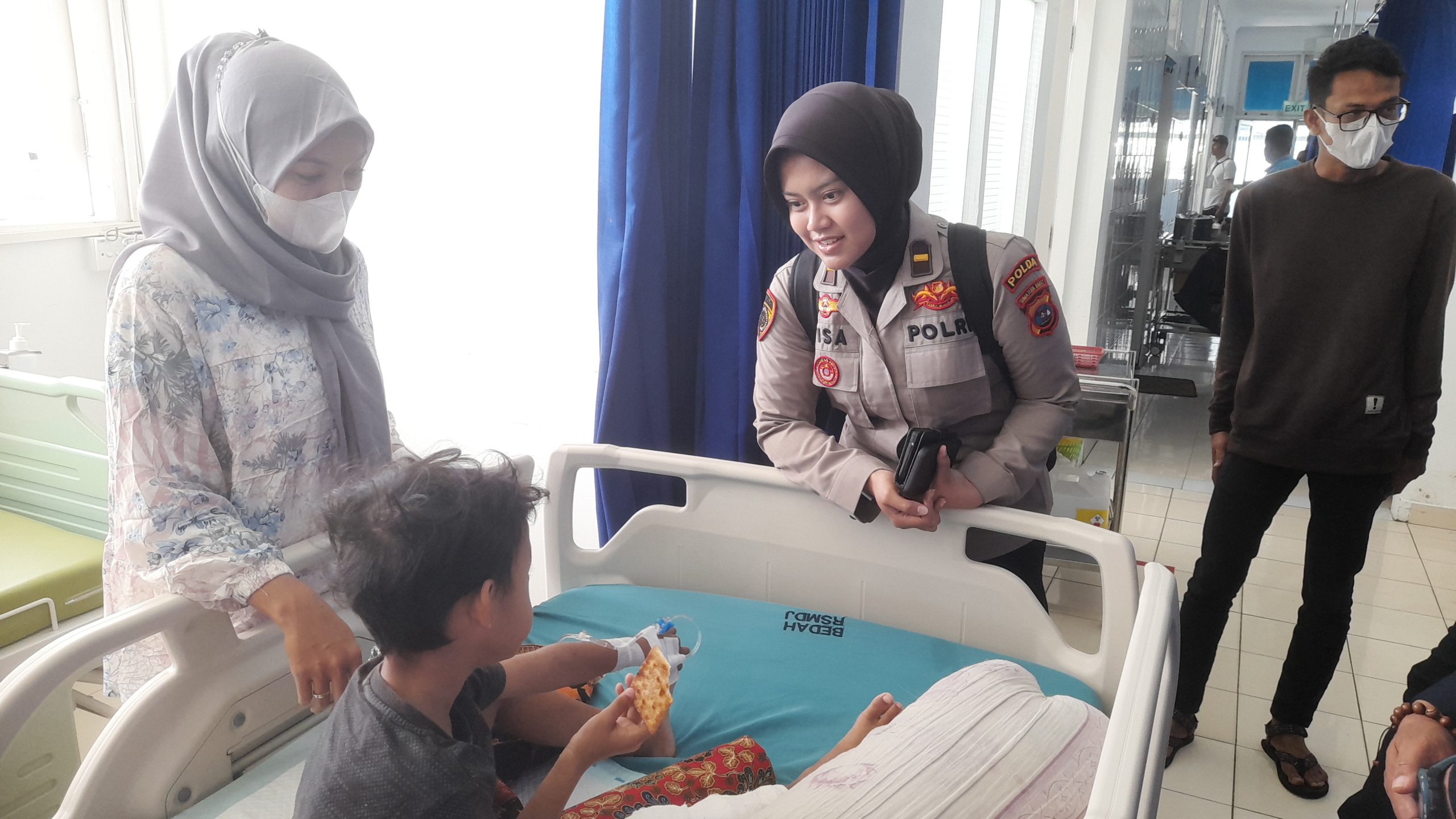 Ipda Disa Aurea Annisa Nureffa, S.Psi dari Bagpsi Biro SDM memberikan layanan trauma healing kepada Keenan, korban kebakaran yang mengalami luka pada kakinya.
