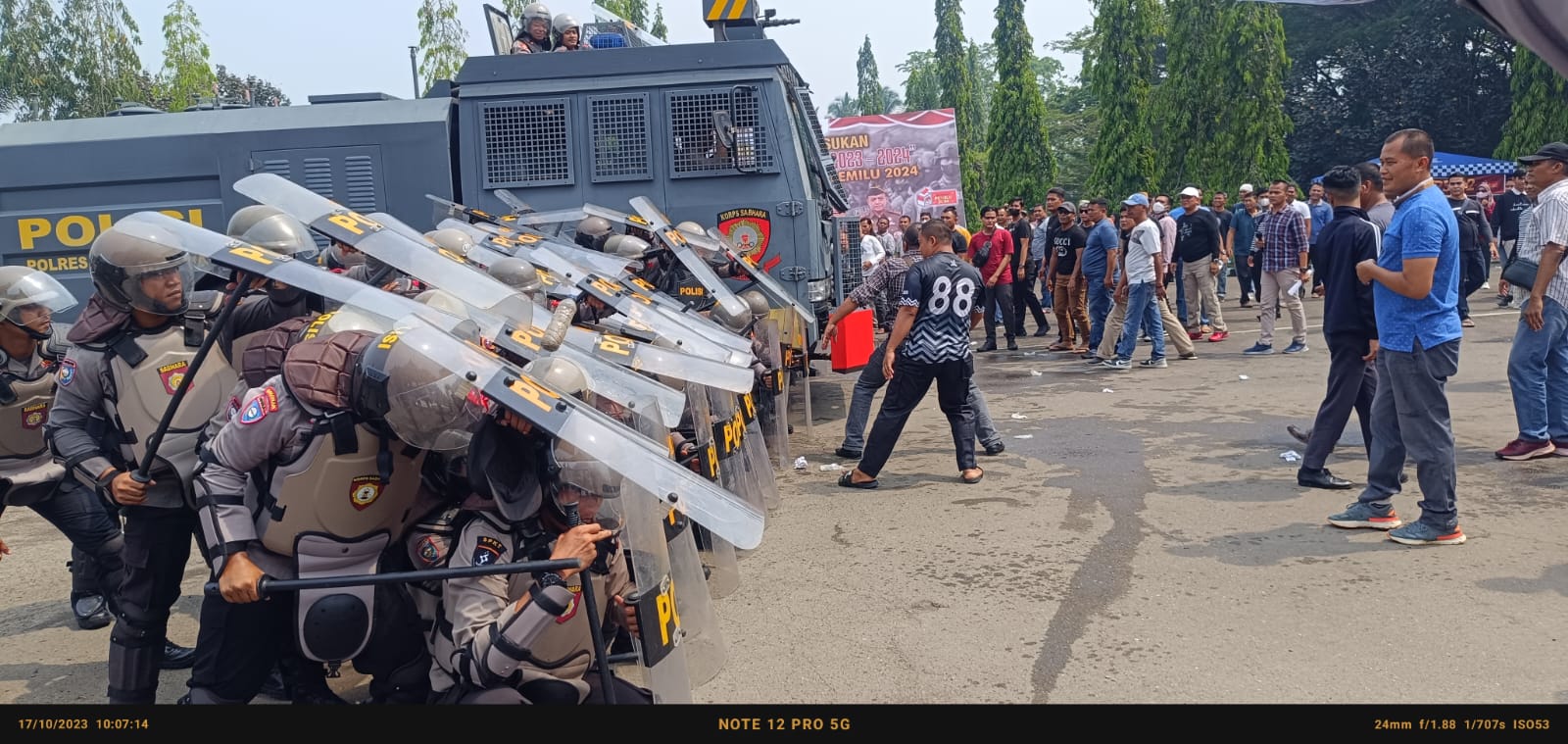 Dharmasraya, Polres Dharmasraya menggelar simulasi SISPAMKOTA aksi unjuk rasa berujung ricuh di Komisi Pemilihan Umum Daerah (KPUD) Dharmasraya. Simulasi dilakukan untuk mengantisipasi gangguan Kamtibmas saat Pemilu 2024, dilaksanakan di halaman Kantor Bupati Dharmasraya, Selasa (17/10/2023).