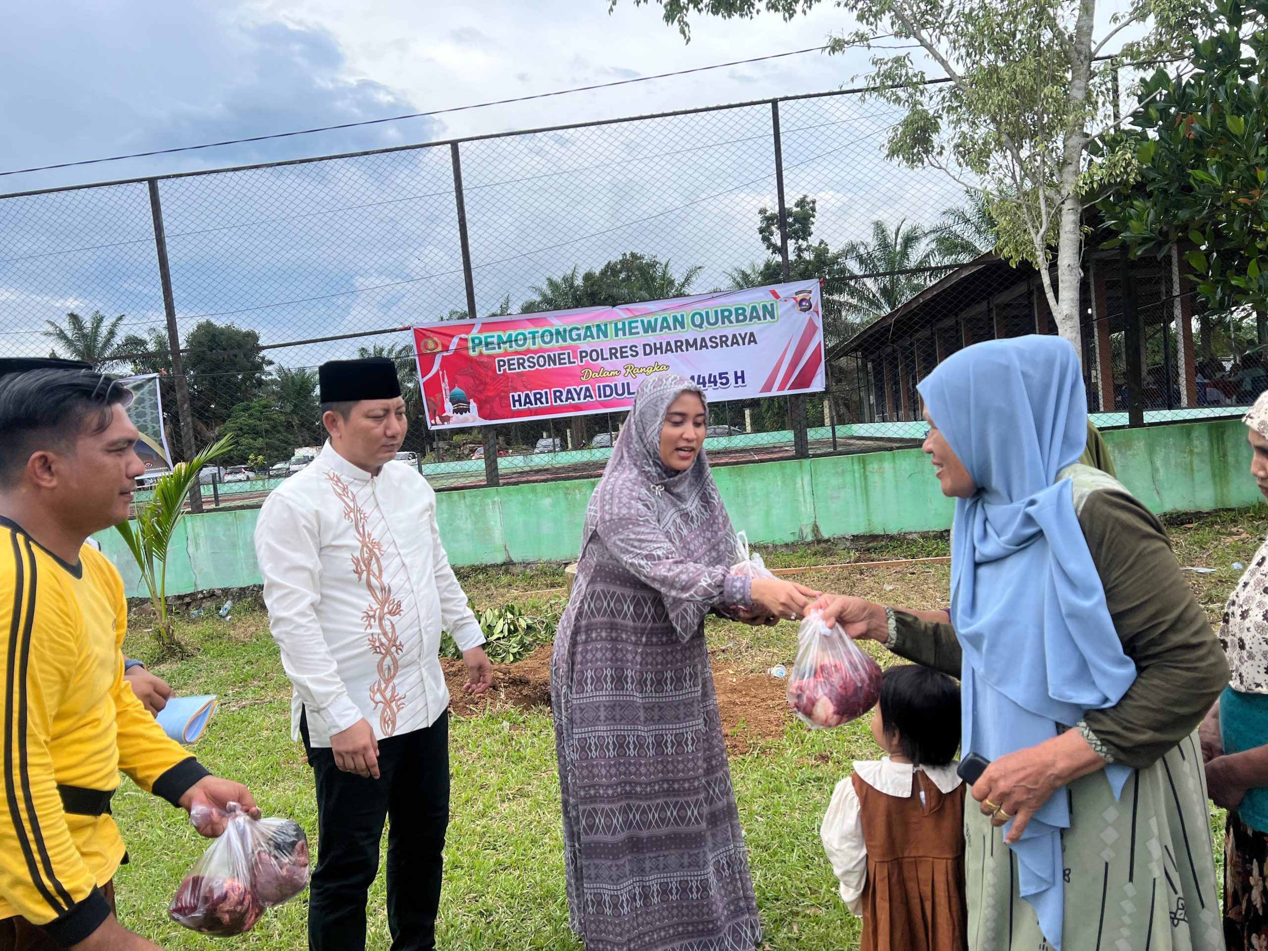 Penyerahan daging dilakukan langsung oleh Kapolres AKBP Bagus Ikhwan, SIK, bersama ketua Cabang Bhayangkari Polres Dharmasrya Ny. Riana Bagus.