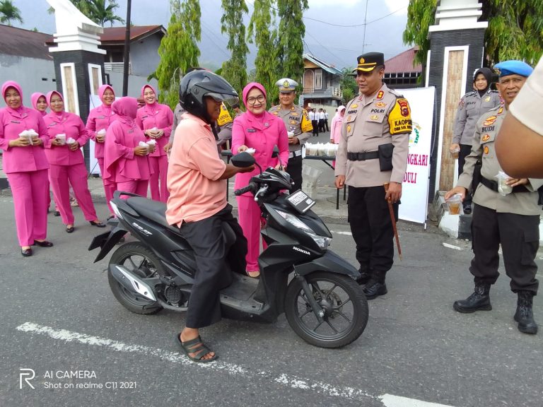Pasaman, Bhayangkari cabang Pasaman mengisi Ramadan 1445 H ini dengan tema bhayangkari Peduli. Kali ini, puluhan takjil dibagikan secara gratis kepada warga yang melintas di depan Mapolres Pasaman, Jumat (15/03/2024).