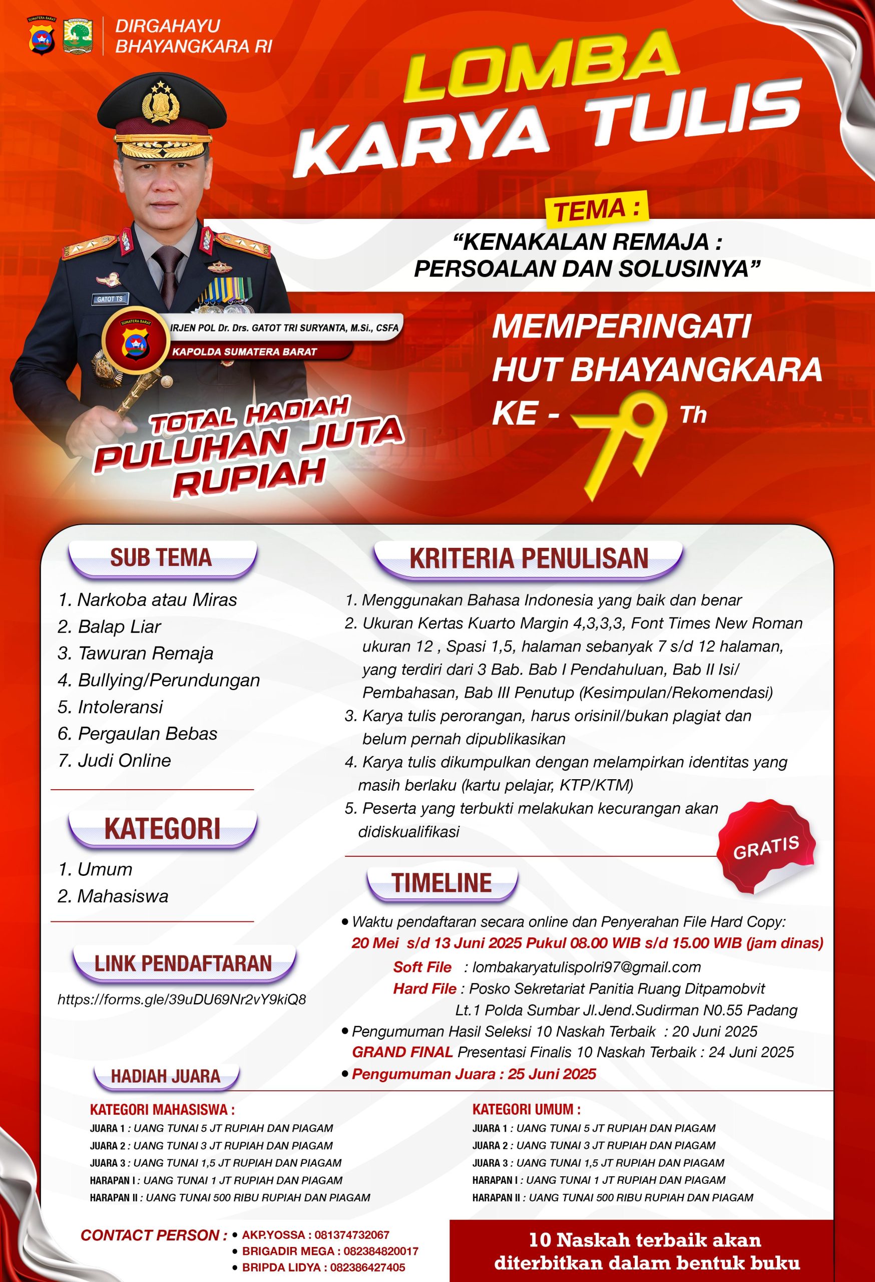 Segera siapkan karya tulis terbaik Anda dan jadilah bagian dari perayaan Hari Bhayangkara ke-79. Informasi lebih lanjut mengenai tema dan pendaftaran akan segera kami umumkan di media sosial Polda Sumatera Barat dan instansi pendidikan terkait.