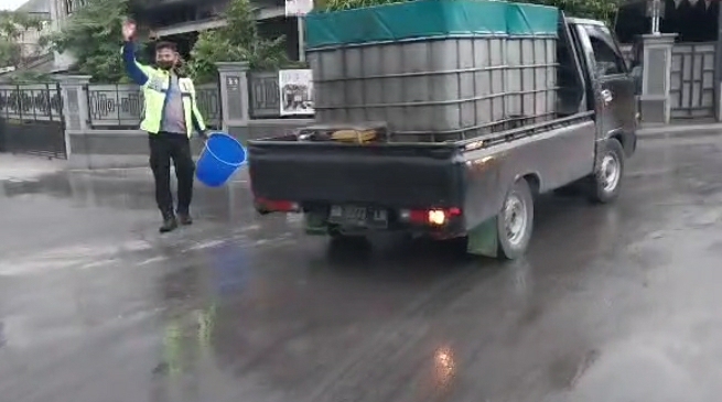 Terlihat, personel Satlantas Polresta Bukittinggi menyirami jalanan dengan air, yang juga dibantu bersama-sama oleh warga sekitar.