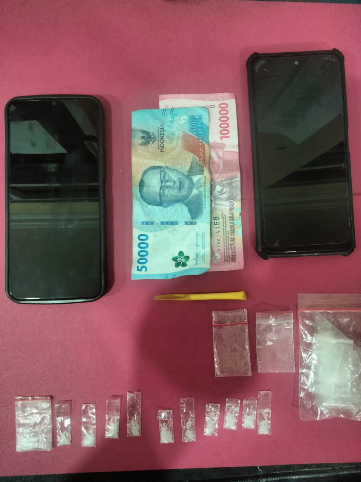 Saat penangkapan, polisi menggeledah dan menemukan beberapa barang bukti. Di antaranya 3 plastik klip berisi kristal bening diduga shabu, yang dikemas dalam 11 paket kecil siap edar, uang tunai Rp150.000, satu sendok shabu dari pipet, satu bungkus plastik bening, dan dua unit HP merk Vivo warna hitam.