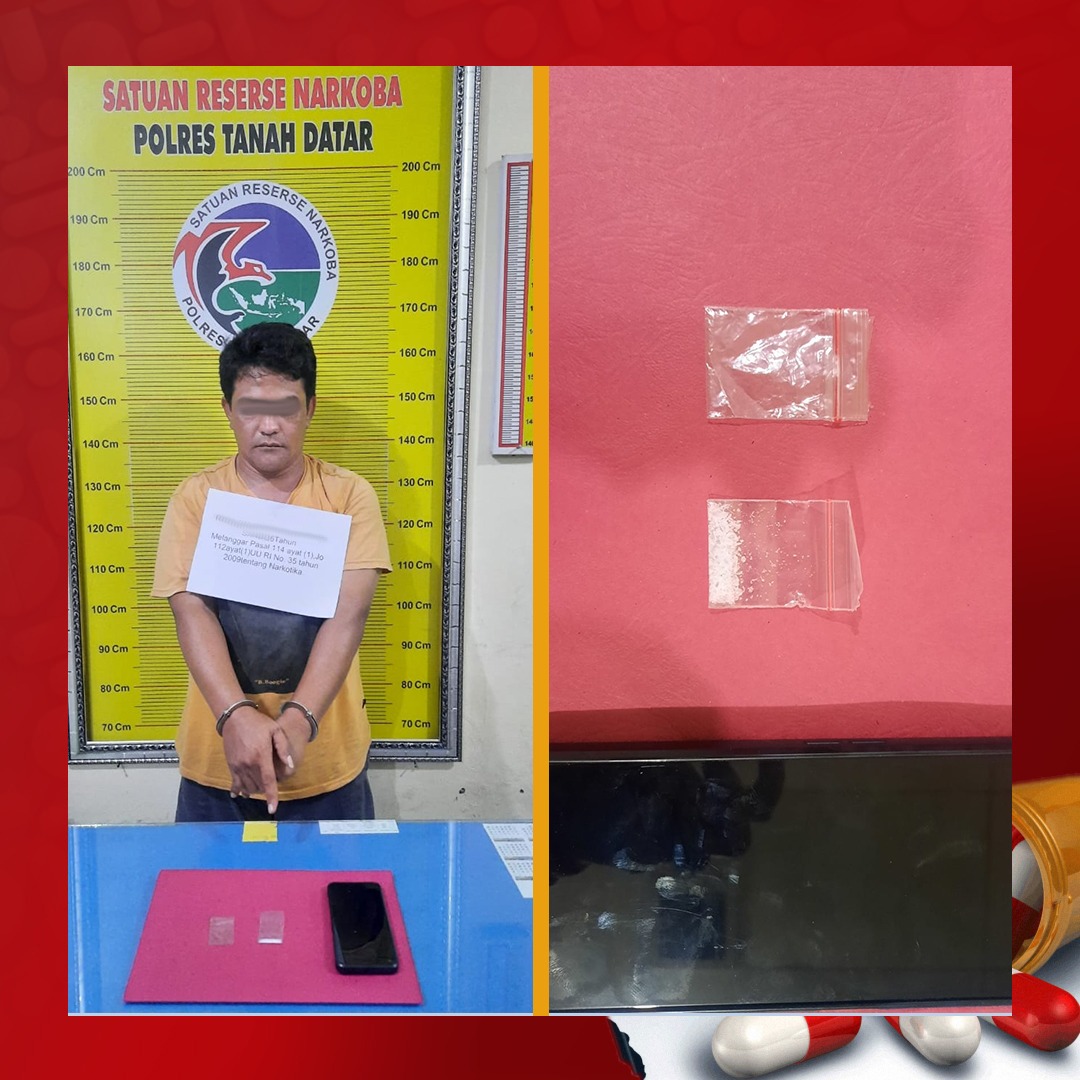 Batusangkar, Dengan terus menekan Penyalahgunaan Narkoba di Wilayah Hukum Polres Tanah Datar, Tim Tarantula Satuan Resere (Satres) Narkoba Polres Tanah Datar kembali berhasil mengamankan 1 orang terduga pelaku penyalahgunaan narkoba golongan I jenis sabu.